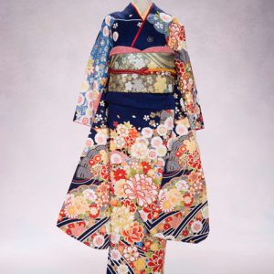絶妙な深さの紺色の生地に、ぱっと目を引く大柄の花たち。近年特に人気な振袖になります。
