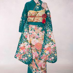 大きい花、小さい花がびっしりと散りばめられた華やかな一着。絶妙な緑のお色味で人気の一着。