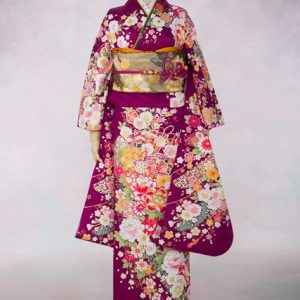 思わず目を引く深い赤紫に、可愛らしい淡いお色のお花が散りばめられた一着。