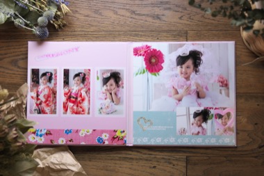 光沢のある写真表面加工されたクオリティーの高い、拘りが詰まったオリジナルアルバムです。花とレースが可愛く写真を引き立てるデザイン。