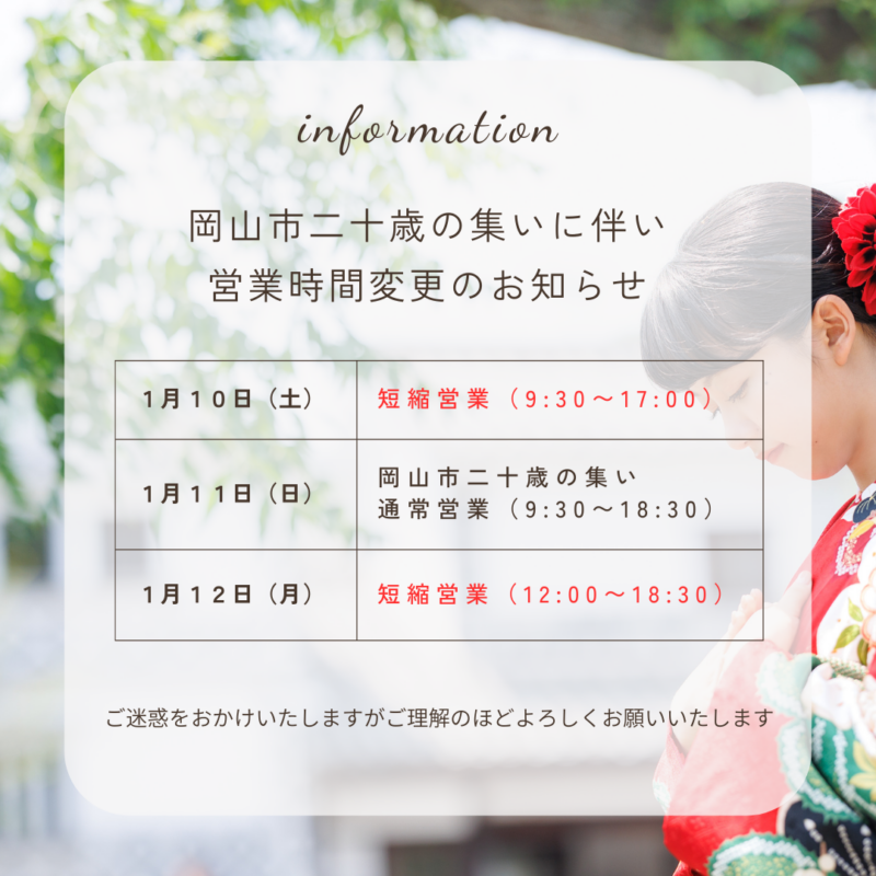 岡山市二十歳の集いに伴い営業時間が変更になります